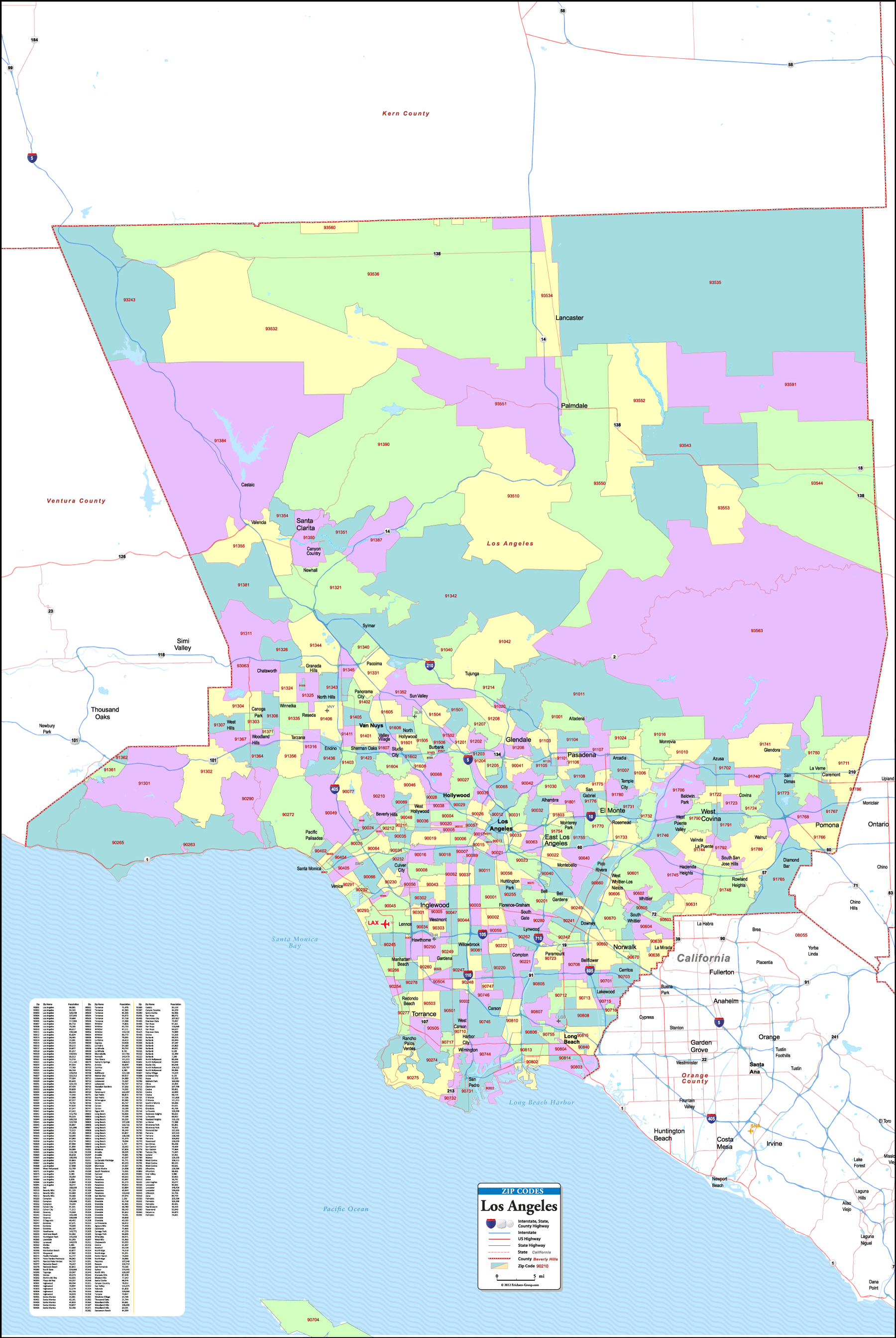 Detailed zipcode map of Los Angeles County, California. With major roadways and cities. Professionally crafted. Population by zipcode index. PDF digital file.